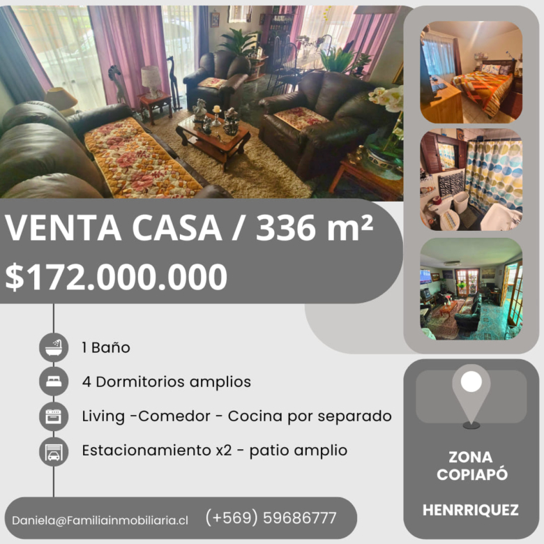 La propiedad se emplaza en un sector residencial consolidado y tranquilo de la comuna de Copiapó; sector de alto flujo vehicular, peatonal y de locomoción colectiva cercana, con vista al poniente cercano a comercio y servicios al encontrarse a pasos del centro cívico comercial de la ciudad; A pasos de avenida circunvalación y avenida Henríquez, importante vías de conexiones dentro de la ciudad; En sus cercanías se encuentran liceos, colegios, jardines infantiles, supermercado, banco estado, hospital, canchas deportivas, áreas verdes, entre otros.